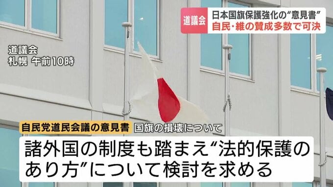 自民党道民会議が提出した意見書案は、日本の国旗に対する侮辱目的での損壊などについて「諸外国の制度も踏まえつつ、法的保護のあり方について検討するよう」国に求めるものです。