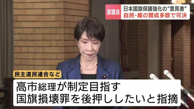 民主道民連合などからは、高市総理が制定を目指す国旗損壊罪を地方から後押ししたい意図だとの指摘もある中、国旗をめぐる議論は今後も続きそうです。