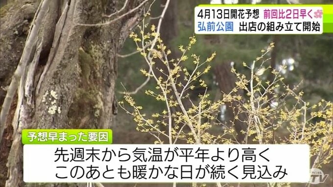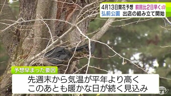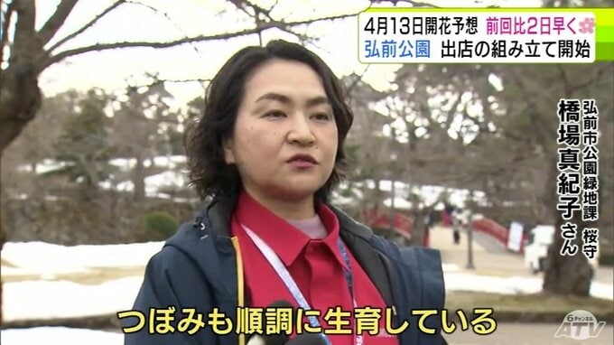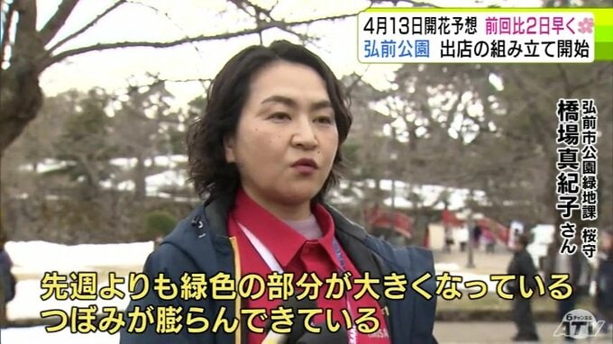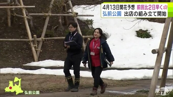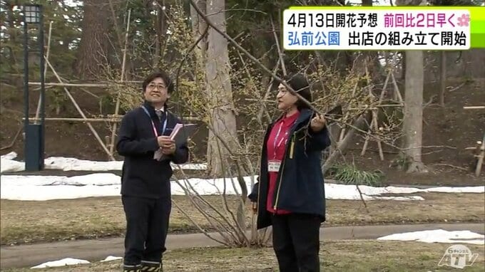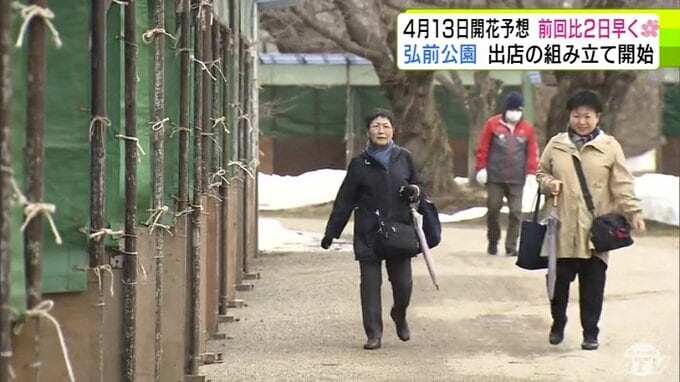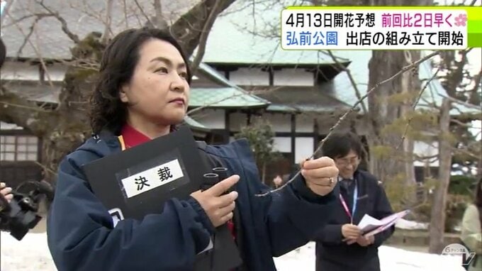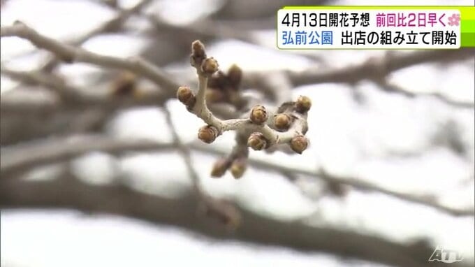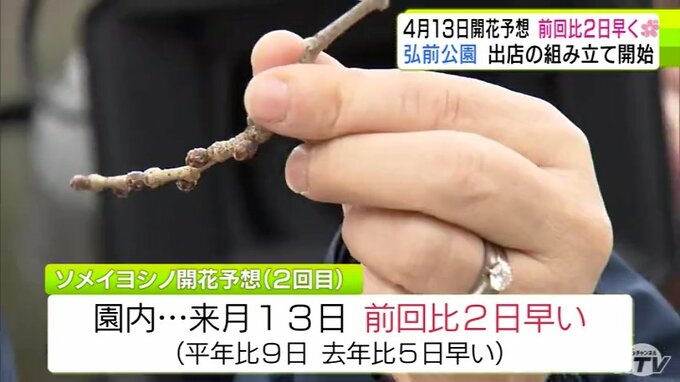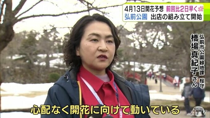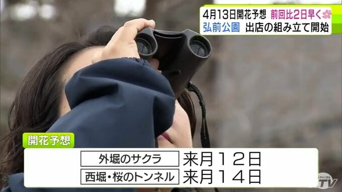青森県弘前市のサクラの名所「弘前公園」で2026年2回目の開花予想を発表 園内のソメイヨシノの開花は前回より2日早い「4月13日」予想に 外堀のサクラは12日 西堀の「桜のトンネル」は14日 青森テレビ 2026年3月19日(木) 21:10 国内 【写真を見る】19日の弘前公園の様子 ※「NEWS DIG」のアプリやサイト以外でご覧の方は、関連リンクから画像をご確認いただけます。