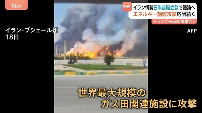日本時間のあす未明に行われる日米首脳会談で大きな焦点となるイラン情勢。エネルギー施設への攻撃の応酬が続くなど、事態は緊迫しています。18日、イラン南部にある世界最大規模のガス田の関連施設に行われた攻撃…