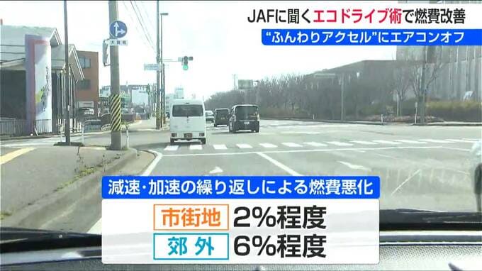 無駄な減速・加速を少なくするために大切なのが『車間距離』で、車間距離が短くなり減速・加速が繰り返されると市街地では2%程度、郊外では6%程度も燃費が悪化します。