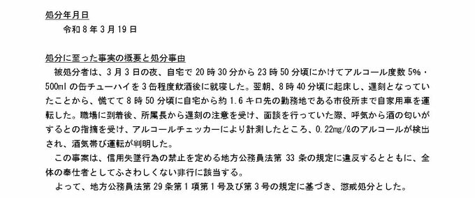 前夜に500ml缶チューハイ3本飲み寝坊→翌朝慌てて車で職場へ→遅刻の注意の面談中に酒の臭い⋯酒気帯び運転で市職員「停職3か月」懲戒処分【高知・安芸】 テレビ高知 2026年3月19日(木) 18:40 国内 安芸市公表「市職員の懲戒処分について」 安芸市公表「市職員の懲戒処分について」 安芸市公表「市職員の懲戒処分について」 ▶記事の画像を見る(14枚) ▶記事を最初から読む
