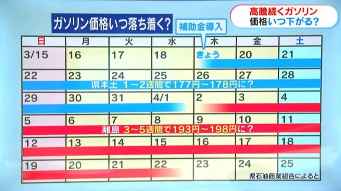 離島では、本土からのガソリンの輸送コストがかかるため、価格が落ち着くには3週間~5週間ほどかかるとみています。価格は県本土より15円から20円ほど高い、193円~198円ほどと予想しています。