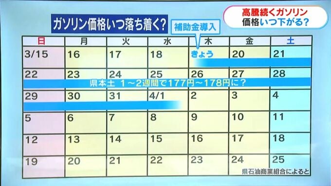 県石油商業組合によりますと、県本土では今後、1~2週間ほどかけて徐々に価格が下がるとみていて、177円~178円程度に落ち着くと予想しています。