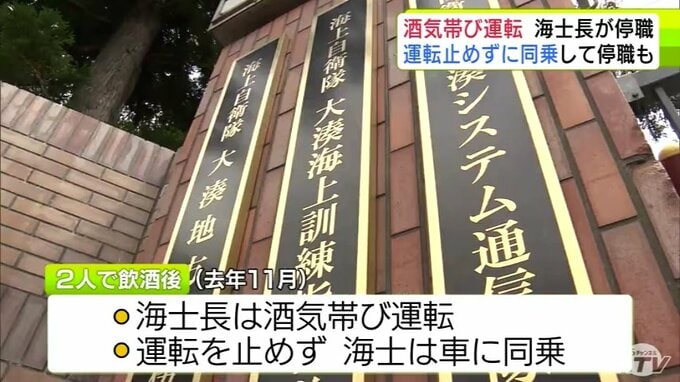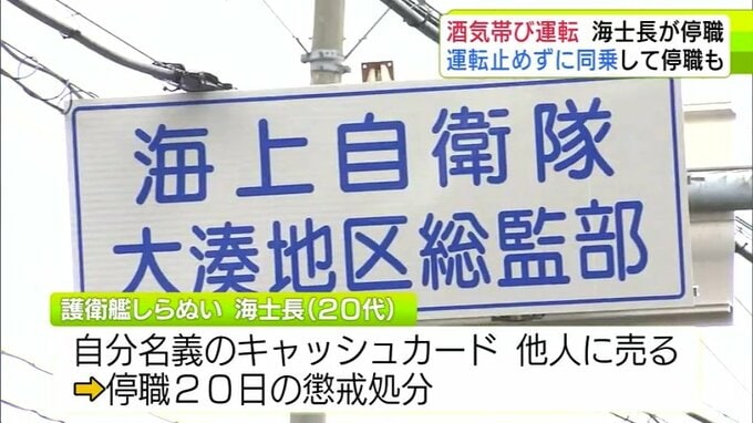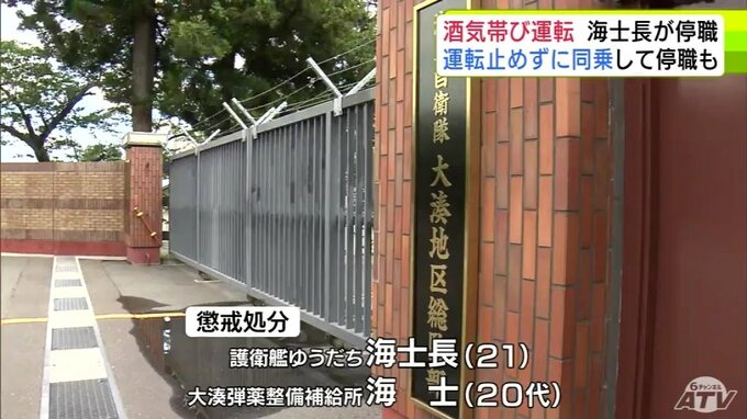 「少しの距離ならばれないと思った…」酒気帯び運転をしたとして21歳の海士長が停職6か月 運転を止めずに一緒に車に乗った同僚も停職20日に 20代の別の海士長は自分名義のキャッシュカードを他人に売り渡したとして停職20日… 海上自衛隊大湊地区総監部 3時間前