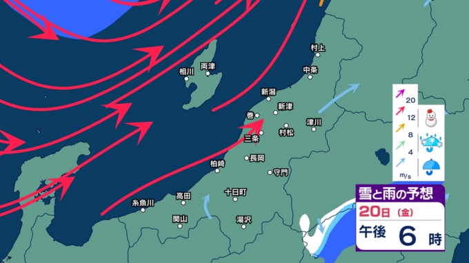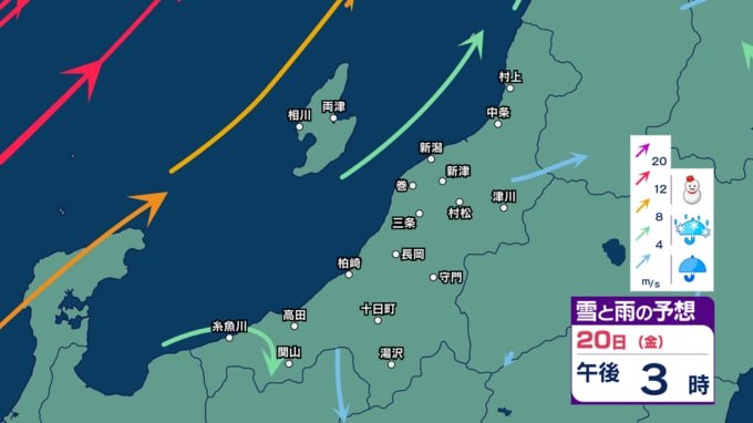 新潟県内は天気の急変に注意 きょう20日夕方~夜遅くは落雷や竜巻などの激しい突風、ひょう、急な強い雨に注意 佐渡は強風に注意・警戒を【今後の雨雪シミュレーション・20日正午更新】 新潟放送 2026年3月20日(金) 12:02 きょう20日(金)の雨と雪のシミュレーション(3時間ごと)