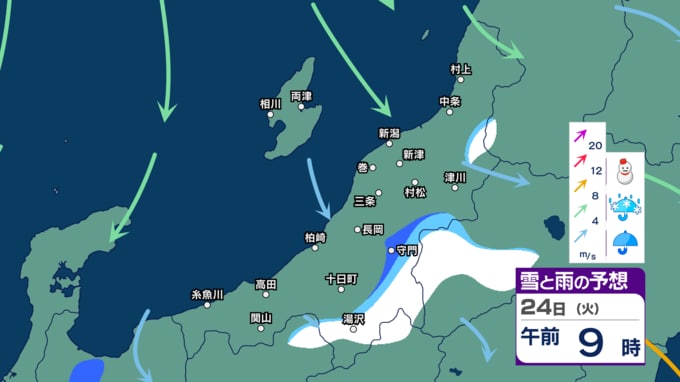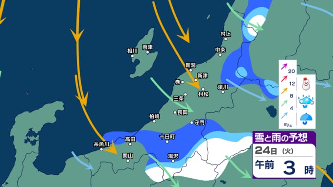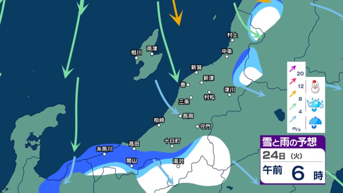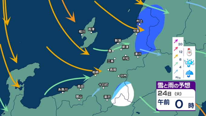 新潟県内は天気の急変に注意 きょう20日夕方~夜遅くは落雷や竜巻などの激しい突風、ひょう、急な強い雨に注意 佐渡は強風に注意・警戒を【今後の雨雪シミュレーション・20日正午更新】 新潟放送 2026年3月20日(金) 12:02 24日(火)の雨と雪のシミュレーション(3時間ごと)