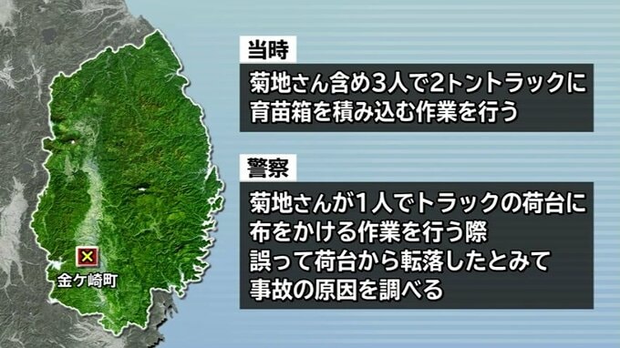 警察は菊地さんが1人でトラックの荷台に布をかける作業を行っていた際、誤って荷台から転落したとみて事故の詳しい原因を調べています。