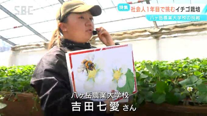かつて大学校でやっていたイチゴの栽培。今年、ガラスハウス一棟で再び始めました。イチゴのことをもっと知ってもらおうと、説明するのは吉田七愛さん。