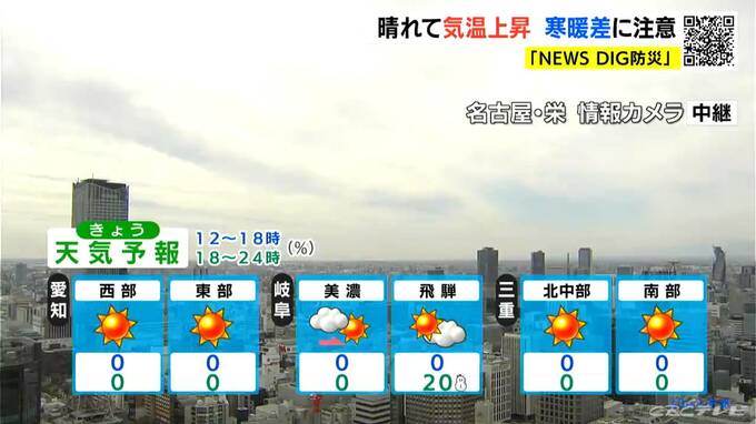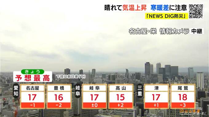 最高気温は名古屋や岐阜、津で17℃、高山では15℃の予想です。朝晩と日中の寒暖差にはご注意ください。