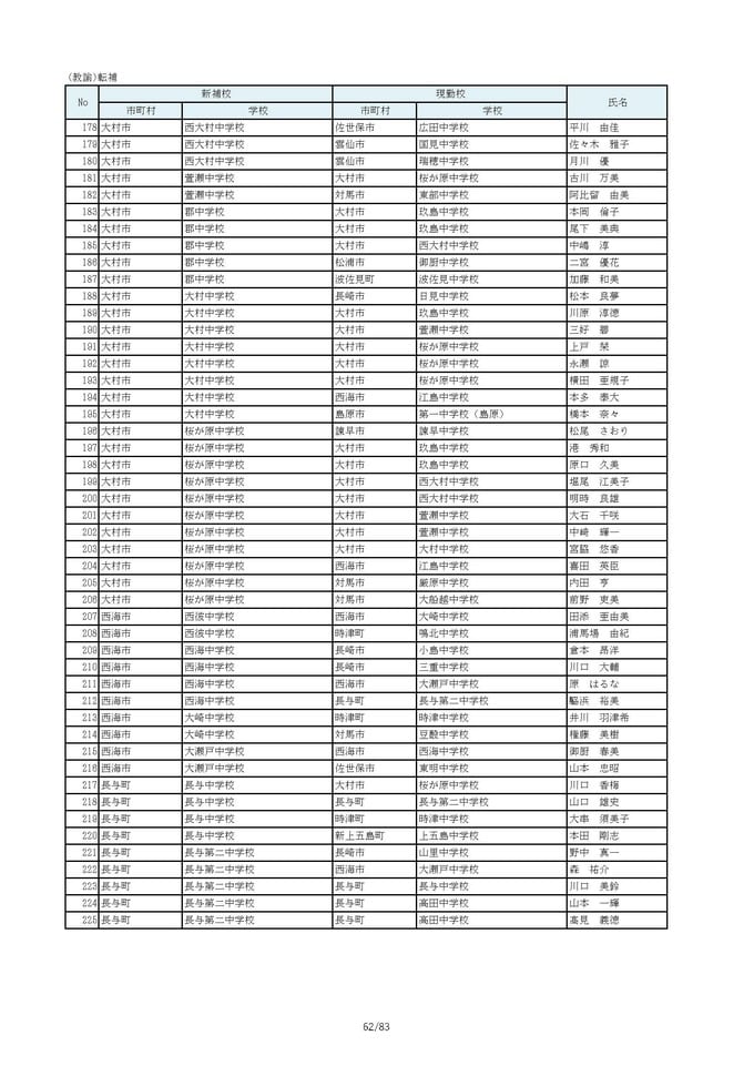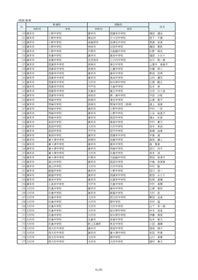 長崎県教職員人事2026 あの先生はどこへ?中学校・義務教育学校(異動・退職・新採用) 全掲載 長崎放送 2026年3月20日(金) 17:00 国内 【教諭・転補】諫早市・大村市・西海市・長与・時津エリア(画像)