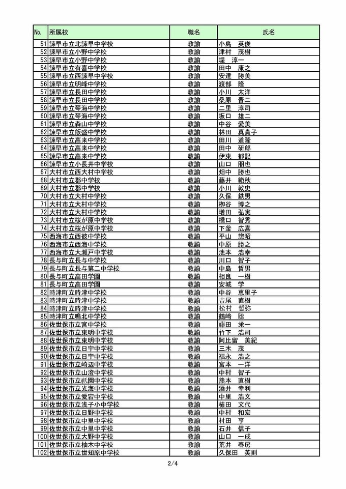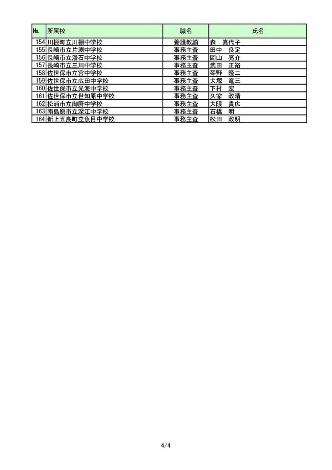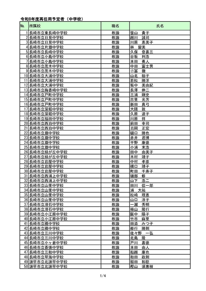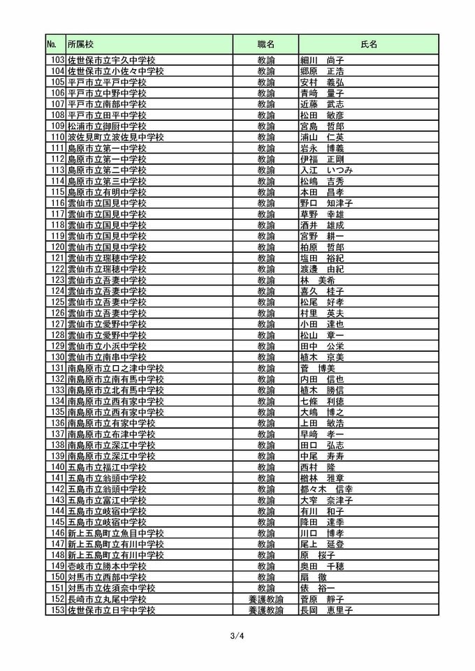 長崎県教職員人事2026 あの先生はどこへ?中学校・義務教育学校(異動・退職・新採用) 全掲載