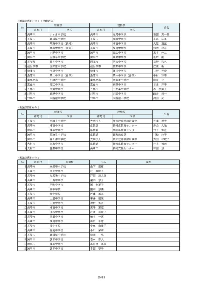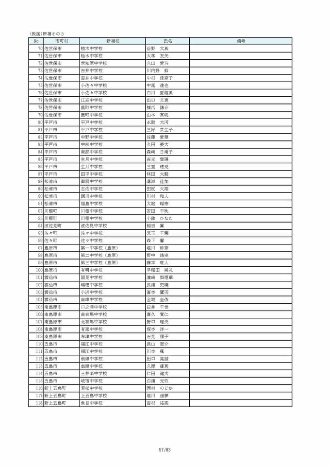 長崎県教職員人事2026 あの先生はどこへ?中学校・義務教育学校(異動・退職・新採用) 全掲載