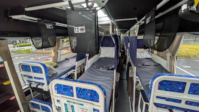 筆者も、東京駅前のバスターミナル東京八重洲から羽田空港までの約40分間、横になって乗り心地を体験しました。乗車の際は、靴を脱いで「くつ箱」に収納します。指定されたのは上段で、はしごを使って頭からシートに潜り込みます。筆者の身長はシートの長さとほぼ同じ約182cmで、体をまっすぐ伸ばすと頭と足がぴったりくっついてしまいました。それでも足を少し曲げれば問題はありません。横幅にも少し余裕があるので寝返りを打ち、横向きになることも可能。揺れや音は気にならず、概ね快適な乗り心地で、40分間の試乗会はあっという間でした。車内の後方にはトイレと、トイレの待ちスペースとしても使える座席が設置されていました。