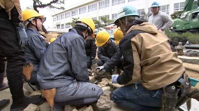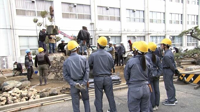 2011年に国が表彰する「現代の名工」に選ばれた近江庭園の寺下弘さんが講師として参加し、現役の職人が庭づくりを実演。造園デザイン科の生徒7人は石材の設置や植栽の剪定などを体験しながらプロの技術を学びました。