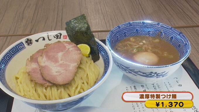オススメの「濃厚特製つけ麺」(1,370円)は、看板商品の「濃厚つけ麺」に、味玉と自家製チャーシューを増量した贅沢な一杯。