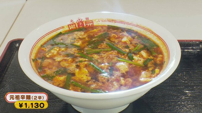 看板メニューの「元祖辛麺」は、本店と同じように選べる辛さは0~30の“31段階”。唐辛子とニンニクが効いた醤油ベースのスープに、卵・ミンチ・ニラを加え、そば粉と小麦粉が主原料の特注麺を合わせたオリジナルの逸品。こんにゃくに似たつるもち食感の麺と旨辛スープとの相性は抜群!