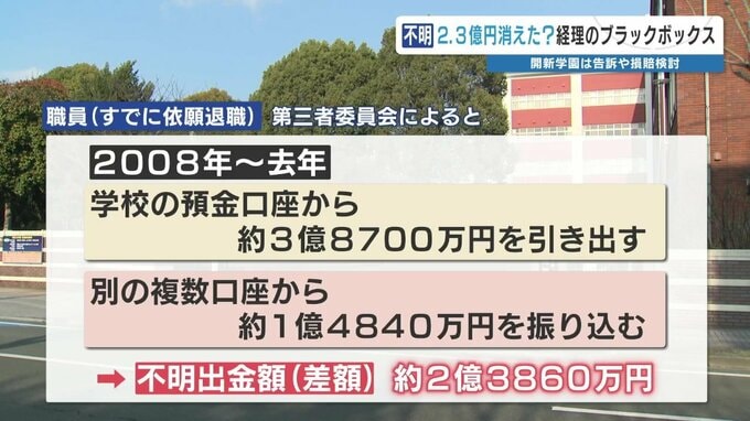 学園は、口座管理を20年以上、実質的に職員1人に任せていたということで、第三者委員会は「経理業務が集中していたことが問題だった」と指摘しました。
