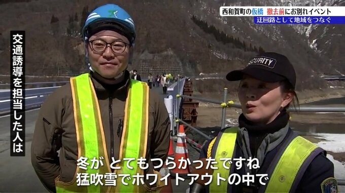 20日は交互通行だった仮の橋で交通誘導を行った2人も橋に別れを告げました。