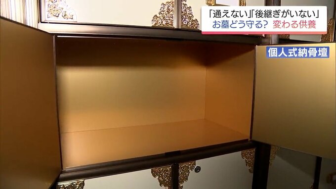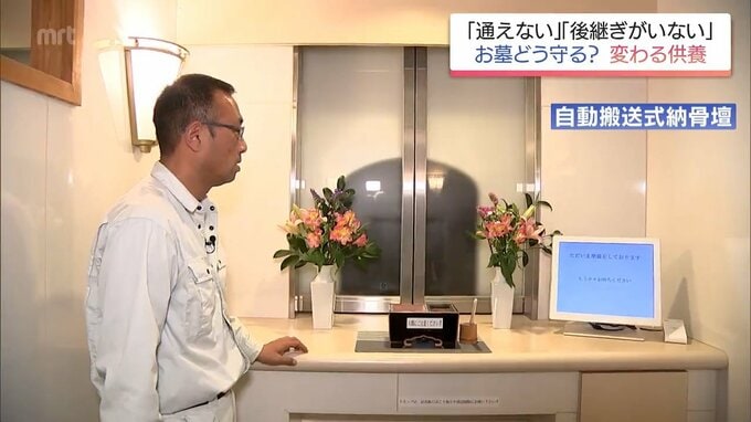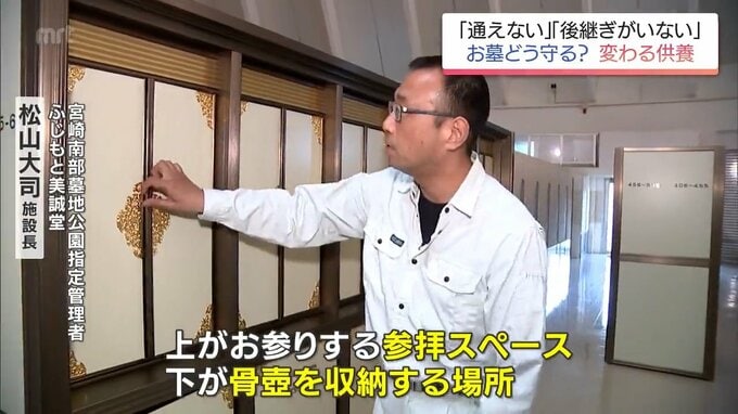 (宮崎南部墓地指定管理者・ふじもと美誠堂 松山大司施設長)「こちらの方が世帯式納骨壇になります。上の方がお参りする参拝スペースになりまして下の方が骨壺を収納する場所になります。」