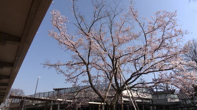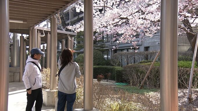 この桜は1996年に岡山県落合町、現在の真庭市から岡山県庁に贈られた「醍醐桜」の苗木が育ったもので、アズマヒガンという早咲きの桜です。ここ数日で見ごろを迎え、訪れた人たちが写真を撮り桜の鑑賞を楽しんでいました。