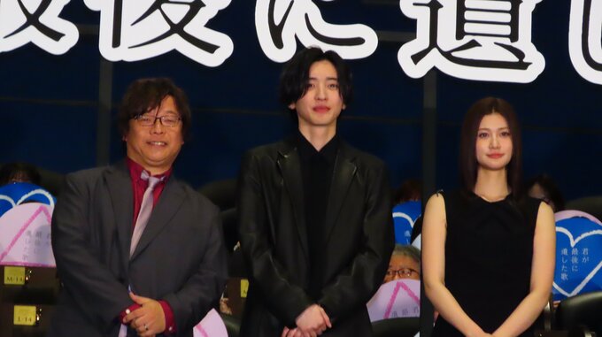 「なにわ男子」の道枝駿佑さん、モデルで俳優の生見愛瑠さん、三木孝浩監督が『君が最後に遺した歌』の初日舞台挨拶に登場しました。