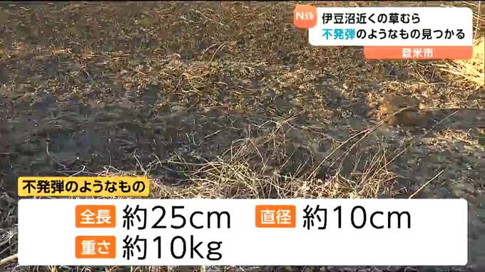 警察によりますと、見つかったものは1個で、全長およそ25センチ、直径10センチ弱で、重さは10キロほどです。全体的にさびていて草むらに転がるような状態で落ちていたということです。