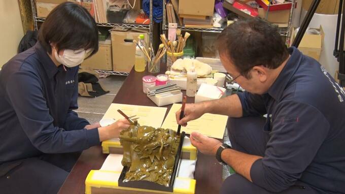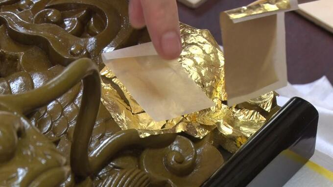 金箔が乾いた上からは再び金箔押しが行われ、その後半透明の漆を塗り重ねる「金薄磨」を経て、ことし夏ごろには正殿に搬入される見込みだということです。