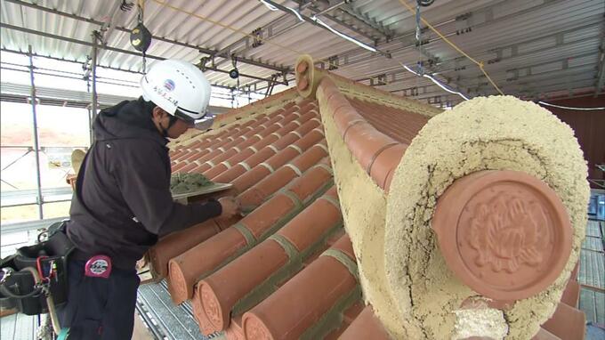 首里城正殿と南殿・北殿をつなぐ両廊下では、先月からおよそ1万3000枚の赤瓦を葺く作業が始まり、今月11日からは瓦と瓦の継ぎ目を漆喰で塗り固める作業が進められています。