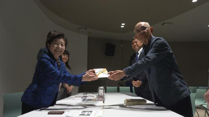 寄付されたのは、去年開催したオペラの上映会などのイベントで集まった募金およそ15万円です。ひめゆり平和祈念財団の仲程昌徳前理事長に手渡されました。