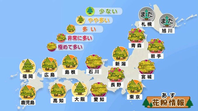花粉飛散はピーク終盤となっています。21日(土)は宮城や愛知、石川では極めて多い予想です。お花見など外出の際はマスクをつけるなど、しっかりと対策を行いましょう。