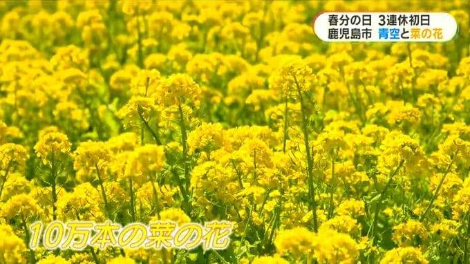 きょう20日は春分の日です。3連休初日、県内は青空が広がりました。鹿児島市でも菜の花など春の花が見頃を迎えています。(記者)「青空のもと、鮮やかな黄色い絨毯が一面に広がっている。日差しも暖かく、全身で…