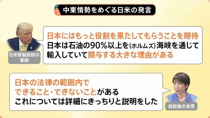 日米首脳会談の冒頭、トランプ大統領は「日本にはもっと役割を果たしてもらうことを期待。日本は石油の90%以上を(ホルムズ)海峡を通じて輸入していて、関与する大きな理由がある」と発言しました。