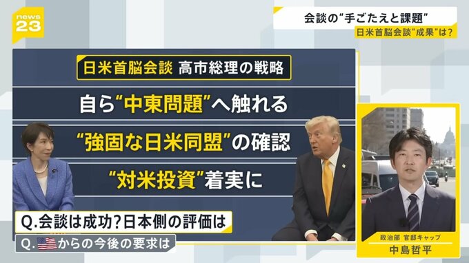 また経済問題について、日米合意に基づくアメリカへの80兆円規模の投資について、日本が着実に履行していく姿勢を見せた。これもトランプ大統領に評価されたうちの一つだと思います。