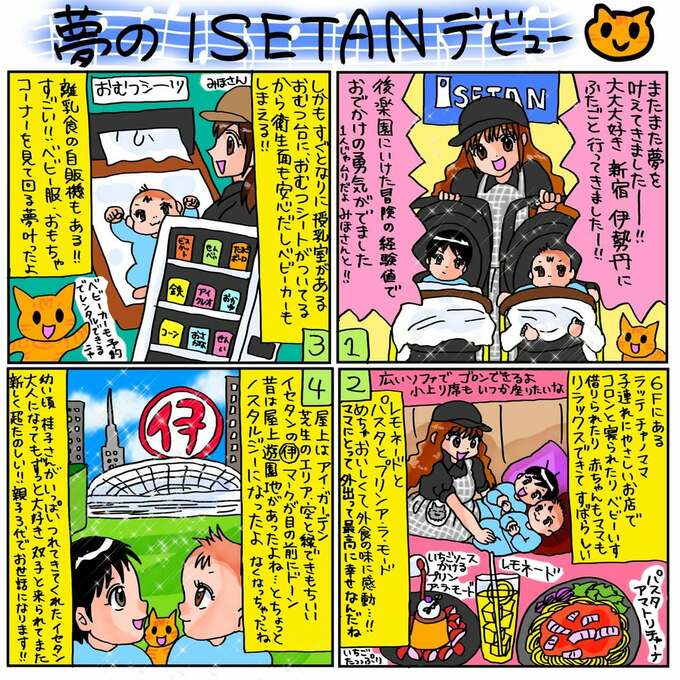 そして翔子さんは「授乳室も素晴らしいしベビーカーは予約で借りられる」とテキストしつつ、絵日記でも「離乳食の自販機もある」「ベビー服・おもちゃコーナーを見て回る夢叶ったよ」と、〝子どもを連れた大人が、余裕をもって子ども用の買い物をできる〟環境を堪能した様子です。