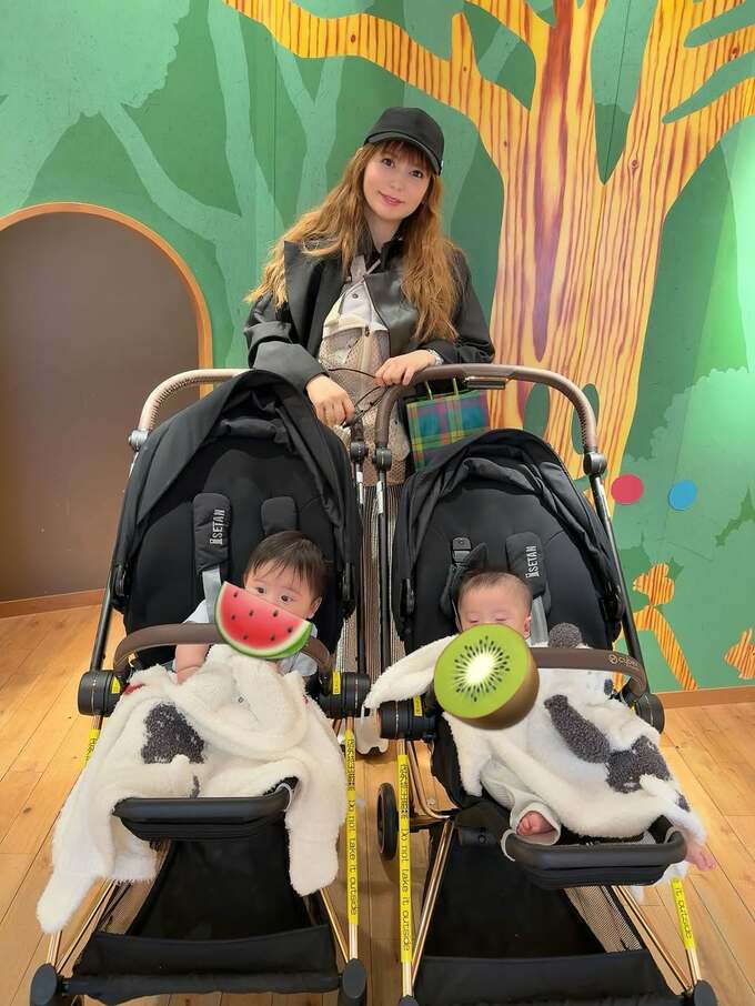 翔子さんは「まだ一人だとなかなか大変なので、いとこのみほさんと」と、大人二人で双子を連れて伊勢丹を訪れたとのこと。1枚目に屋上庭園で双子を乗せたベビーカーとの3ショット写真を投稿しました。
