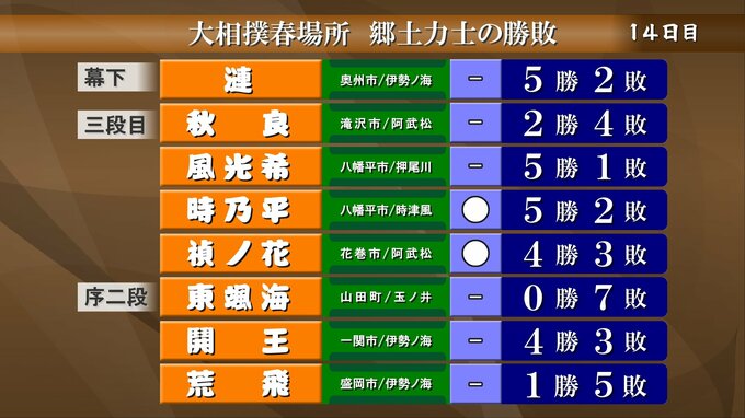 大相撲春場所14日目郷土力士の取り組みの結果です。勝ち越しに向けて後がない錦木は千秋楽に望みをつなぎました。