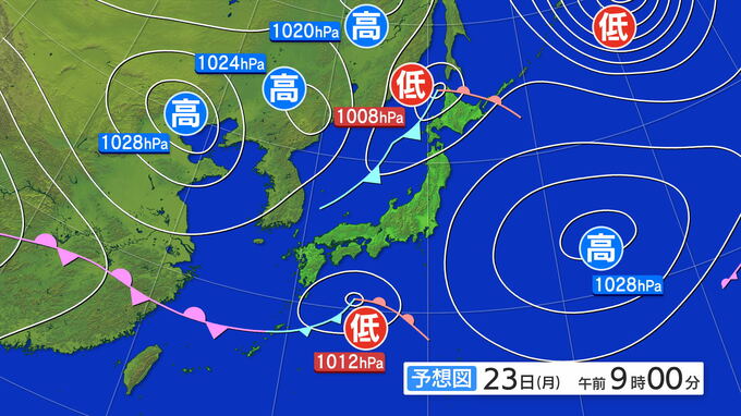 23日午前9時の予想天気図では、低気圧は東南東方向に進むでしょう。23日の午前中は東海や関東などで雨雲がかかるところがありそうです。