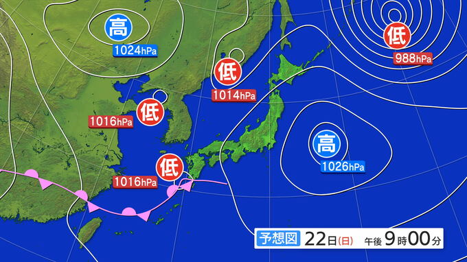 22日午後9時の予想天気図です。九州の西の海上に低気圧があり、前線を伴っています。九州など西日本で暖かく湿った空気が流れ込み雨が降る見込みです。
