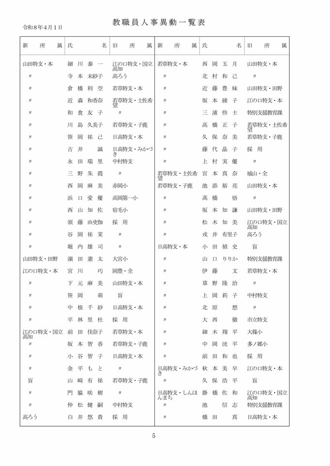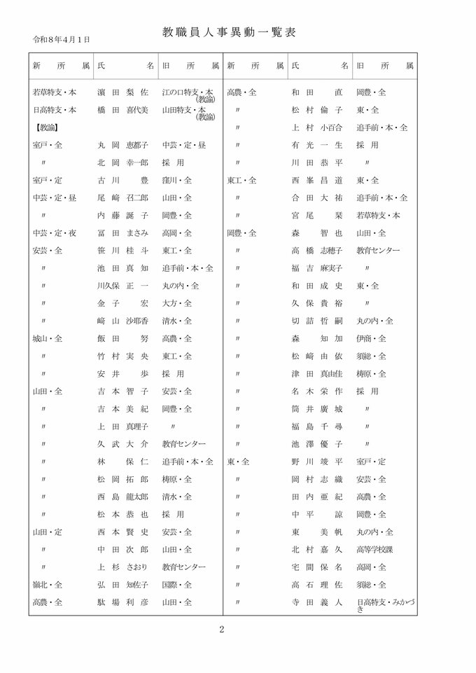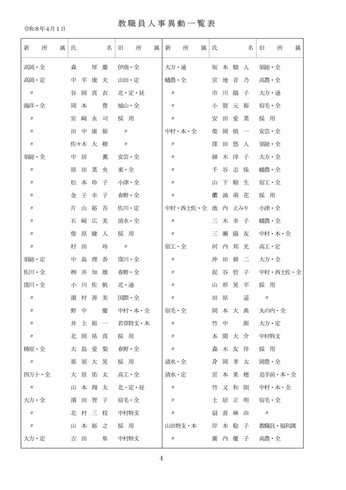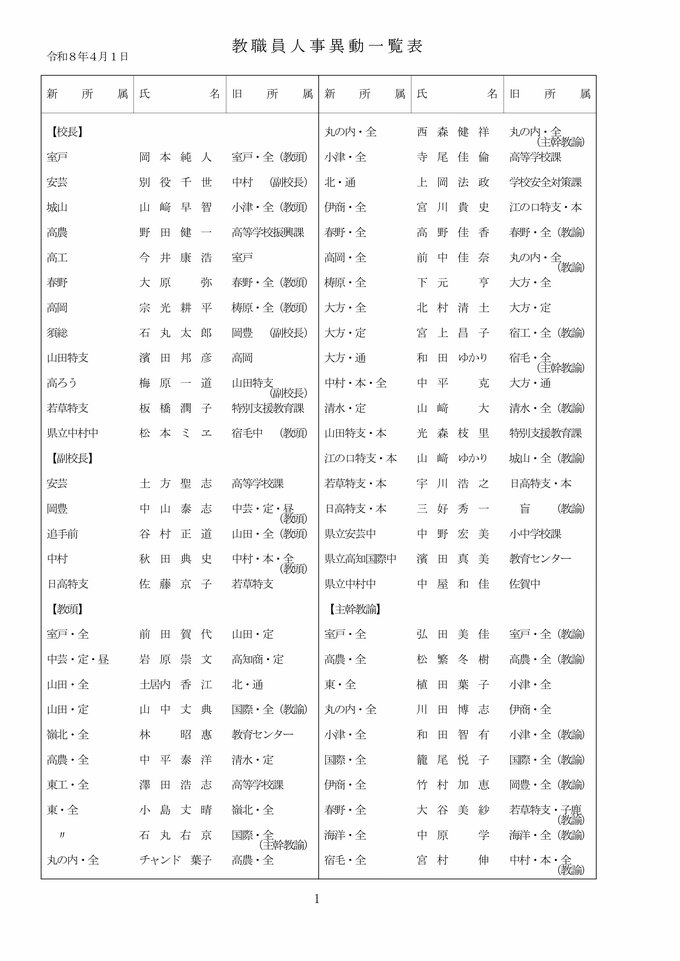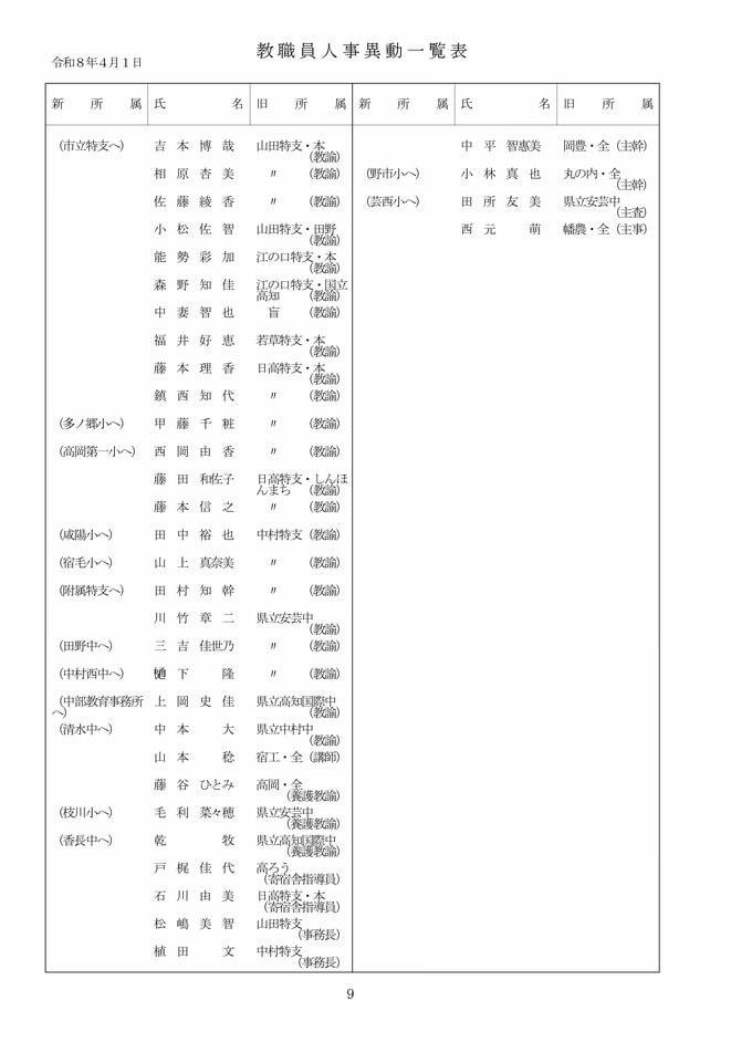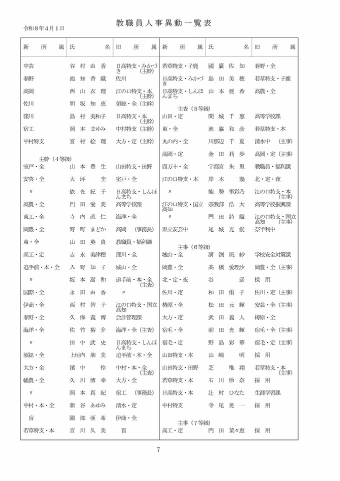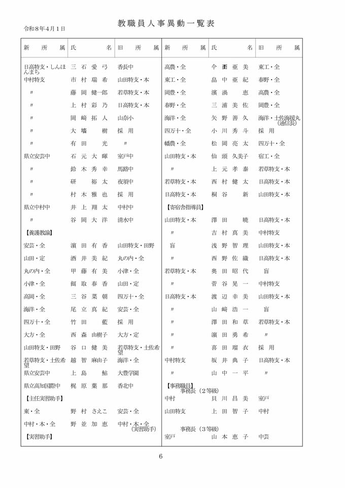 【全掲載】高知県 教職員 2026年度 人事異動② 県立中学校・高校・特別支援学校
