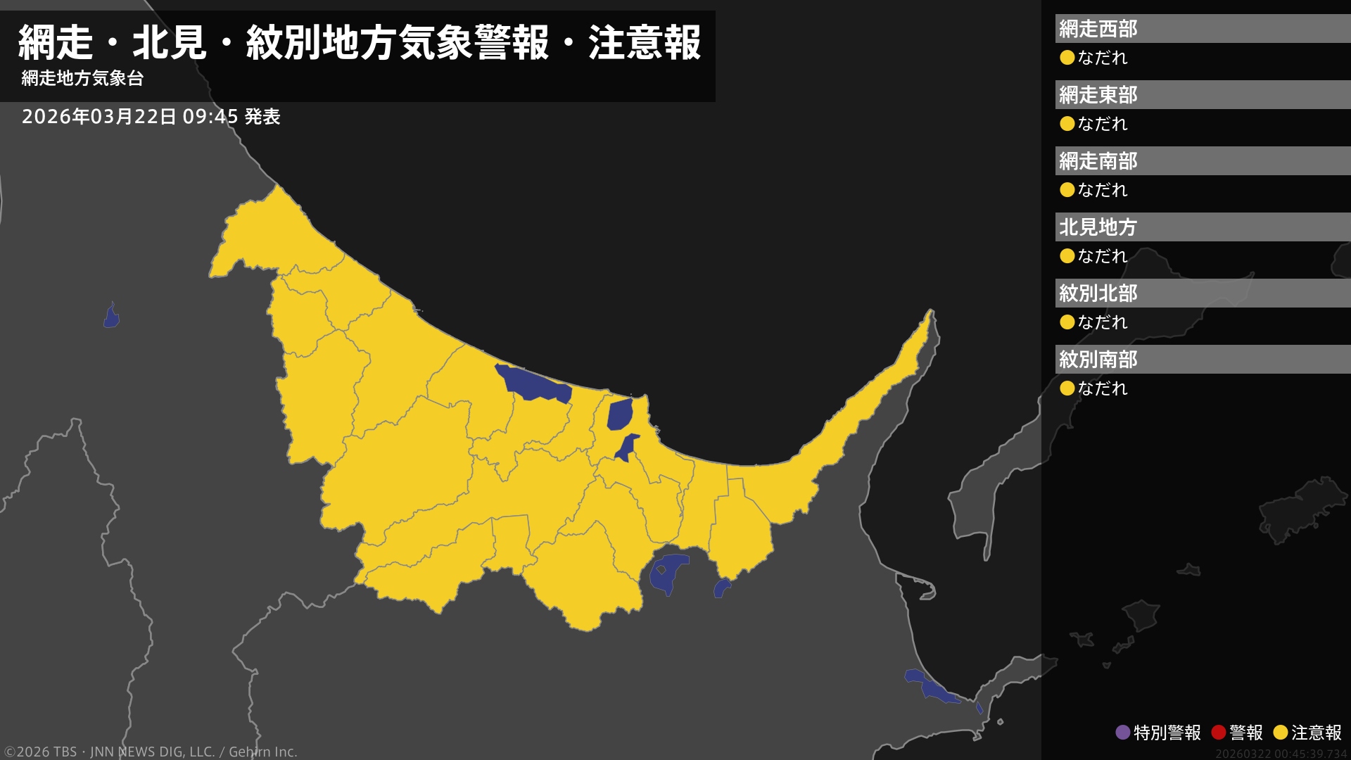 気象台は、午前9時45分に、なだれ注意報を北見市北見、北見市常呂、網走市、紋別市、美幌町、津別町、斜里町、清里町、小清水町、訓子府町、置戸町、佐呂間町、遠軽町、湧別町、滝上町、興部町、西興部村、雄武町、大空町に発表しました。