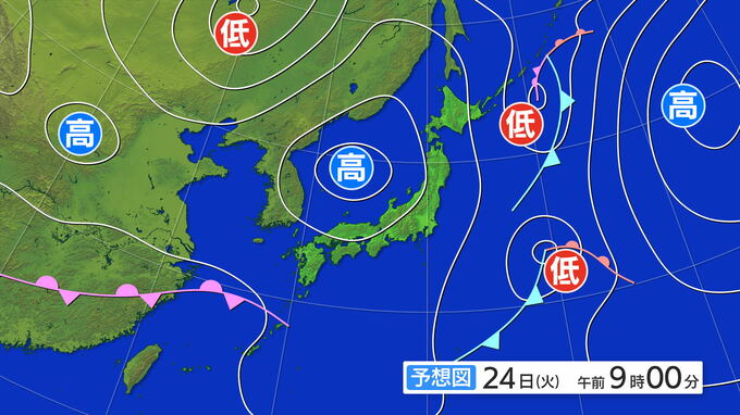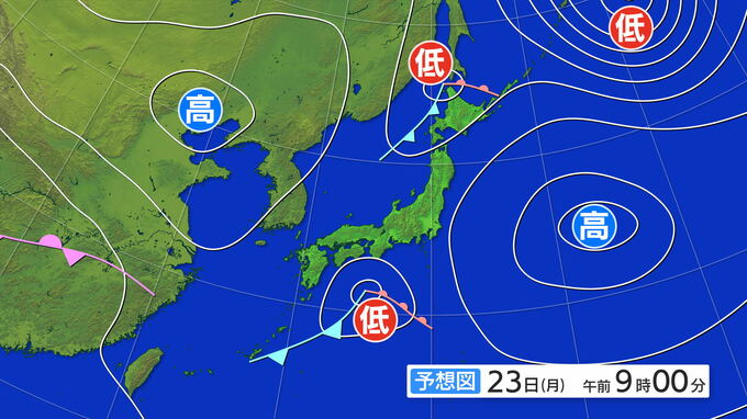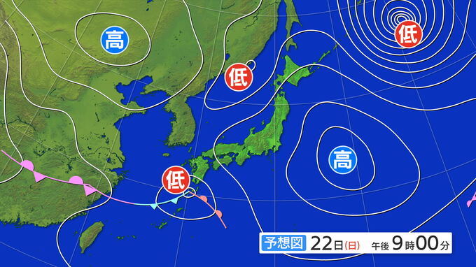 22日(日)夜には、九州南部付近を「低気圧」が前線を伴って通過します。そのため、鹿児島県では、局地的に積乱雲が発生し落雷や竜巻などの激しい突風のおそれがあります。