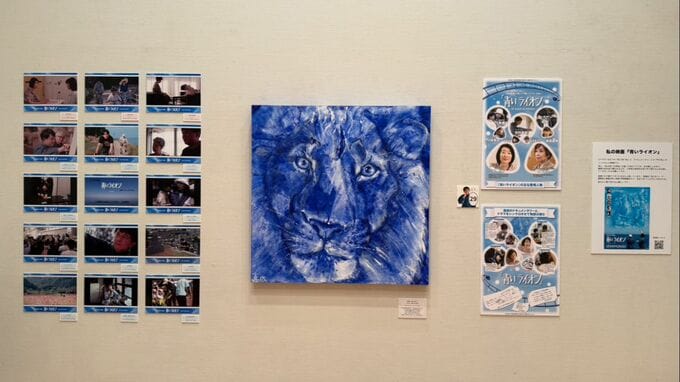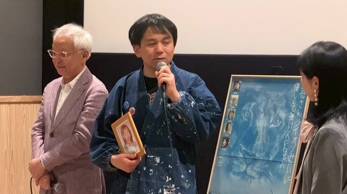 石村嘉成さんは、2005年に病で亡くなった有希子さんの写真を手に登壇し、映画に登場する嘉成さんの作品「ブルーライオン」に込められた思いを話りました。