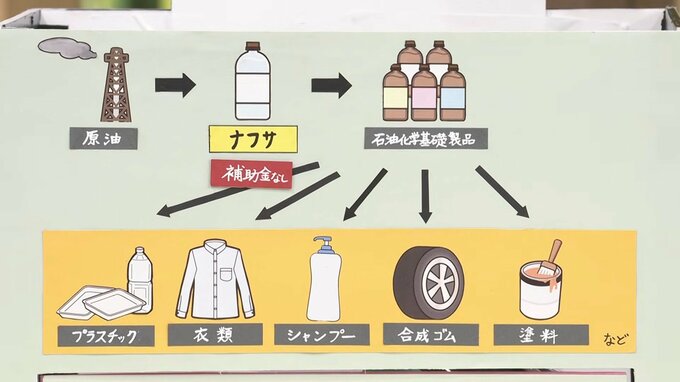 あらゆるプラスチック製品に加え、衣類やシャンプーなどの大もとの原料になる「ナフサ」も原油から作られますが、ここにはガソリンのような補助金は適用されていません。