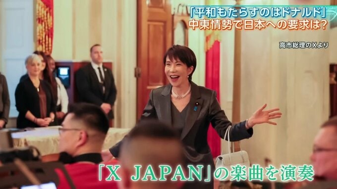 ホワイトハウスで行われた夕食会では、高市総理がファンだというX Japanの曲が流れ、友好ムードが演出されます。
