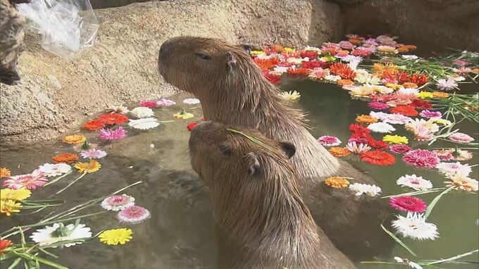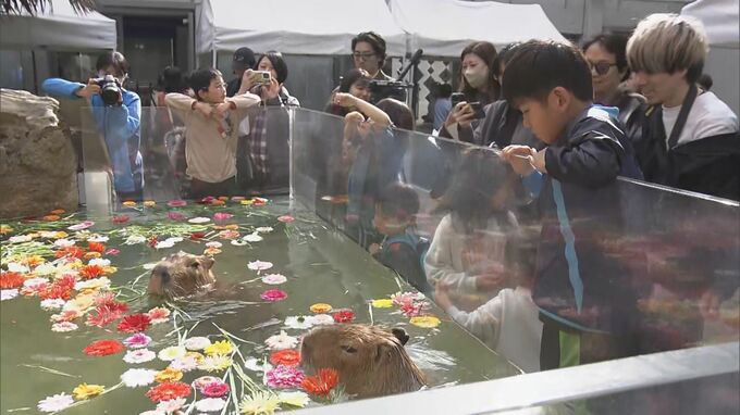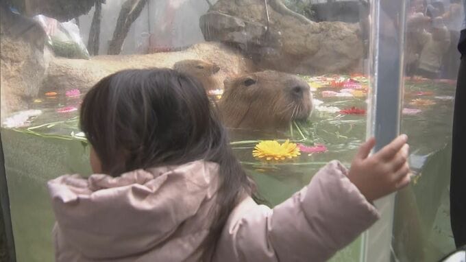 岐阜県各務原市の水族館でカピバラが花を浮かべたプールで泳ぎ、訪れた人たちを楽しませました。