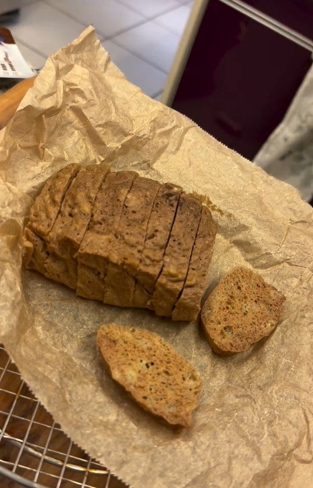続けて「卵1 バナナ1 プロテインの粉大さじ2 今回はチョコレート味 米粉大さじ2 はちみつ大さじ1 アルミフリーベーキングパウダー 小さじ1 シナモン適量 あっても、なくても」と、材料について記しました。