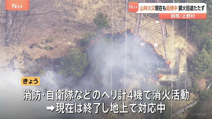 群馬県上野村できのう発生した山林火災は、現在も延焼中です。きのう午前11時半ごろに発生した群馬県上野村の山林火災は、1日以上がたった現在も鎮火のめどが立っていません。消防によりますと、きょうは午前6時半…
