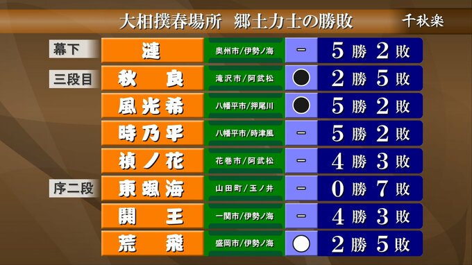 三段目の秋良は負けて2勝5敗、同じく風光希も負けて5勝2敗、序二段の荒飛は勝って5勝2敗で今場所の取り組みを終えました。