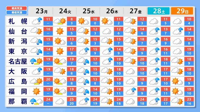 また、低気圧による雨や、高気圧に覆われて晴れることで気温が上がり、雪解けが進む見込みです。気象庁は、北日本から西日本の積雪の多い傾斜地では、25日(水)にかけて、なだれに注意するよう呼び掛けています。
